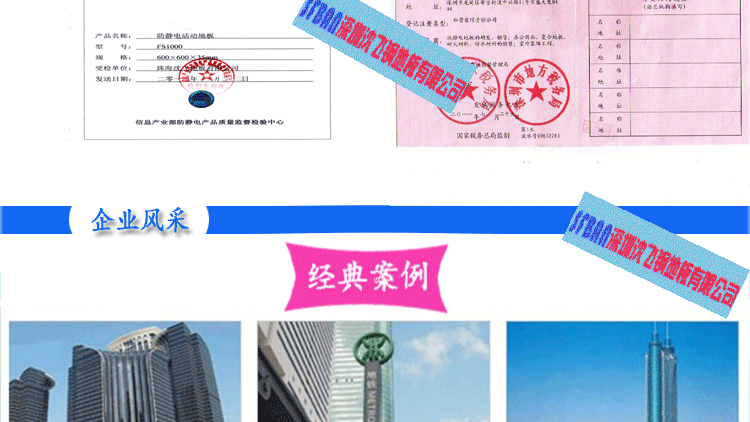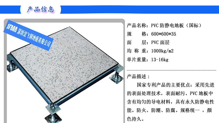 PVC全鋼高架地板 產品型號: 2.00MMPVC全鋼高架地板 規格: 600×600×35㎜ 產品說明: 永久性防靜電PVC地板是一種彈性均質的氯乙烯地面材料,其內部的PVC顆粒表面有一層導...